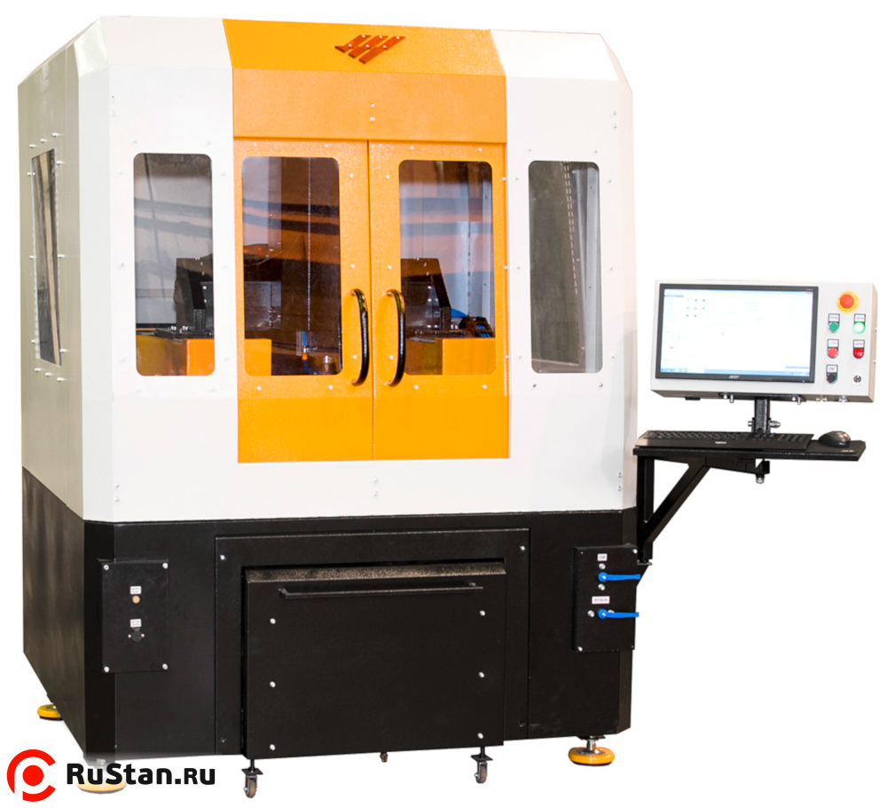 Станок портальной конструкции с подвижным порталом. При этом направляющие закреплены горизонтально, т. е. параллельно плоскости рабочего стола, что обеспечивает значительно большую жёсткость конструкции по сравнению со схемой вертикального расположения направляющих.