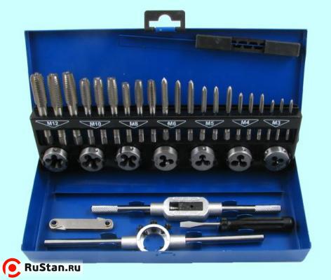 Комплектация набора: метчики комплект из 3шт Р6М5 M3x0.5, M4x0.7, M5x0.8, M6x1, M8x1.25, M10x1.5, M12x1.75; плашки круглые Р6М5 M3x0.5, M4x0.7, M5x0.8, M6x1, M8x1.25, M10x1.5, M12x1.75; вороток для метчиков М3-М12; плашкодержатель М3-М12; ; отвертка.