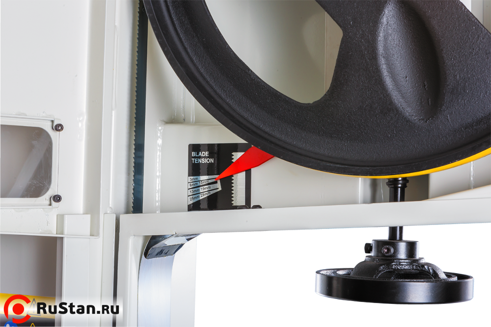 Механизм натяжения и центрирования ленты включает в себя две группы трехроликовых направляющих на шарикоподшипниках, стрелочный индикатор уровня натяжения, регулирующие маховики, два смотровых окошка и рычаг быстрого натяжения-ослабления. Он не совсем обычен, поскольку имеет не два, а три фиксированных положения: рабочее (плотно натянуто), для хранения (лента ослаблена, но держится на шкивах) и сервисное (для замены полотна). Чтобы улучшить плавность работы, использованы полнотелые массивные чугунные шкивы.