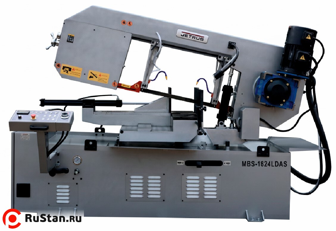 Ленточнопильный станок MBS-1824LDAS представляет собой традиционную модель промышленного оборудования, применяемого для серийного производства. Модель имеет конструкцию европейского типа. Тяжелая литая консоль и большие тиски с гидрозажимом позволяют выполнять пиление металлических заготовок большого диаметра. Пиление под прямым углом допускает максимальный диаметр заготовки в 460 мм. Под углом в 45° станок способен осуществлять распил заготовок диаметром 460 мм. Особенность конструкции станка MBS-1824LDAS заключается в возможностях осуществлять распил прямоугольных заготовок, в том числе под углами -45°/+60°. Допускаемое сечение обрабатываемой заготовки при 90° составляет 350x650 мм, при пилении под углом ±45° — 350x460 мм и при повороте на +60° — 350x310 мм.