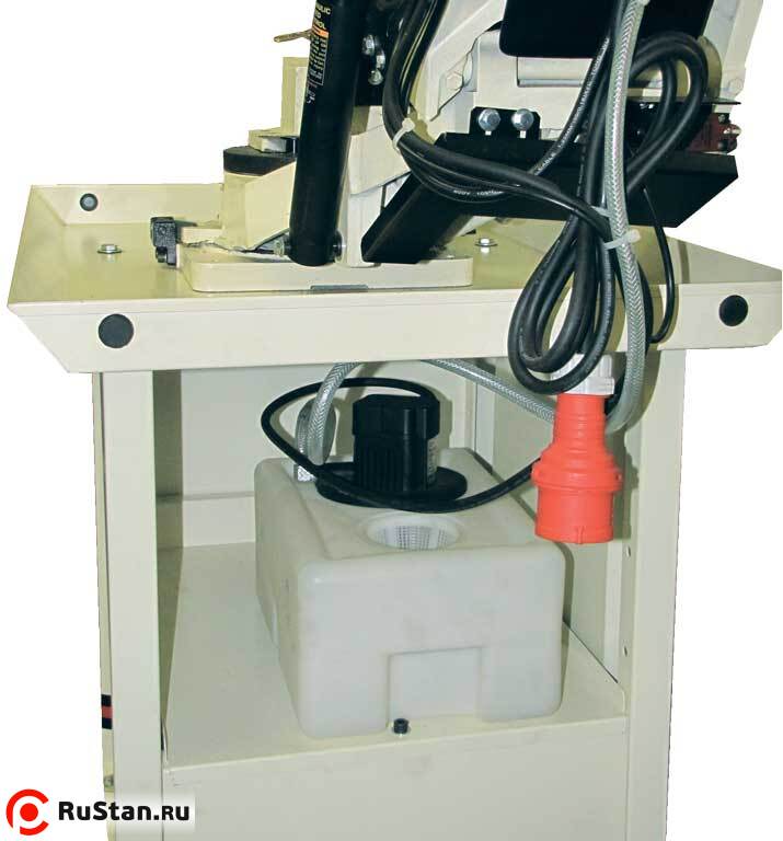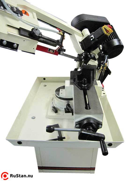 Пильная рама оборудована направляющими, обеспечивающими регулировку прохода пила в зависимости от диаметра заготовки. Направляющие имеют эксцентриковые подшипники, благодаря которым осуществляется позиционирование ленточного полотна в строго вертикальном положении относительно заготовки. Натяжение полотна выполняется в ручном режиме. Для этой цели в торцевой части консоли имеется маховик. Установка и крепление заготовки обеспечивается механическими быстрозажимными тисками. Быстрая фиксация заготовок одного диаметра выполняется с помощью рычага.