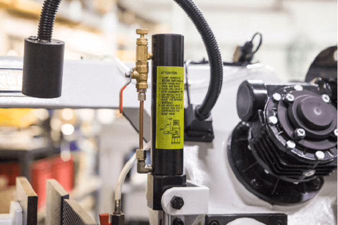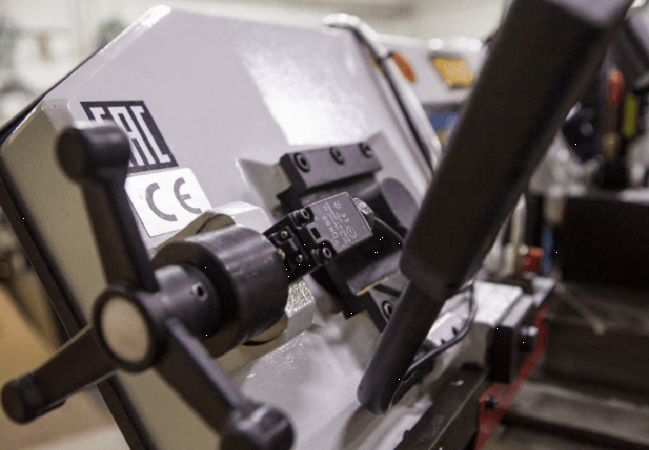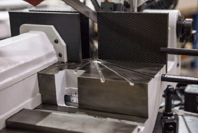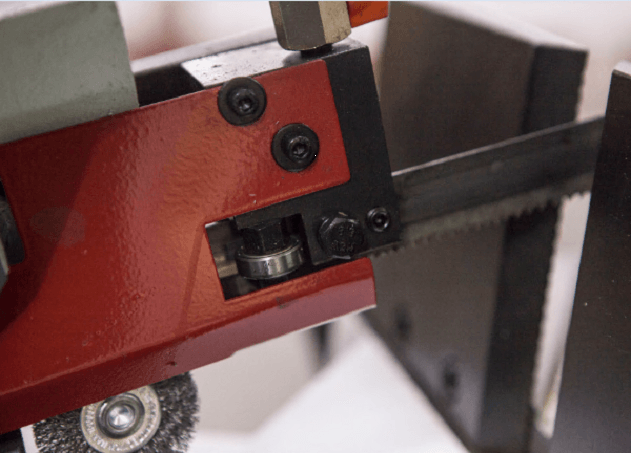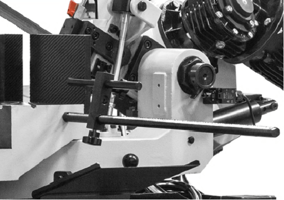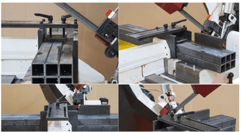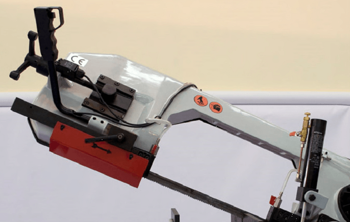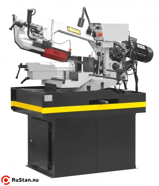 Режущий инструмент — ленточная пила, сваренная в кольцо. Полотно натягивается вручную с помощью натяжного шкива и приводится в движение через редуктор. Пила опускается под собственным весом, а дросселируемый гидравлический цилиндр обеспечивает плавную регулировку скорости опускания в зависимости от профиля заготовки для оптимального режима резания.