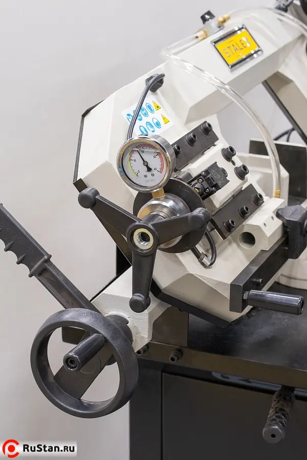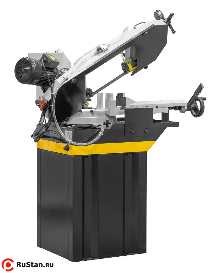 Модель имеет быстрорегулируемые тиски для резки под углом, поворачивается рама, а не заготовка. Тиски с системой быстрого отвода ускоряют процесс смены заготовки (ускоренный отвод подвижной губки происходит без вращения маховика). Зажим заготовки осуществляется тисками вручную, подача заготовки - также вручную. Наличие системы СОЖ в стандартной комплектации – позволяет добиться высокой производительности.