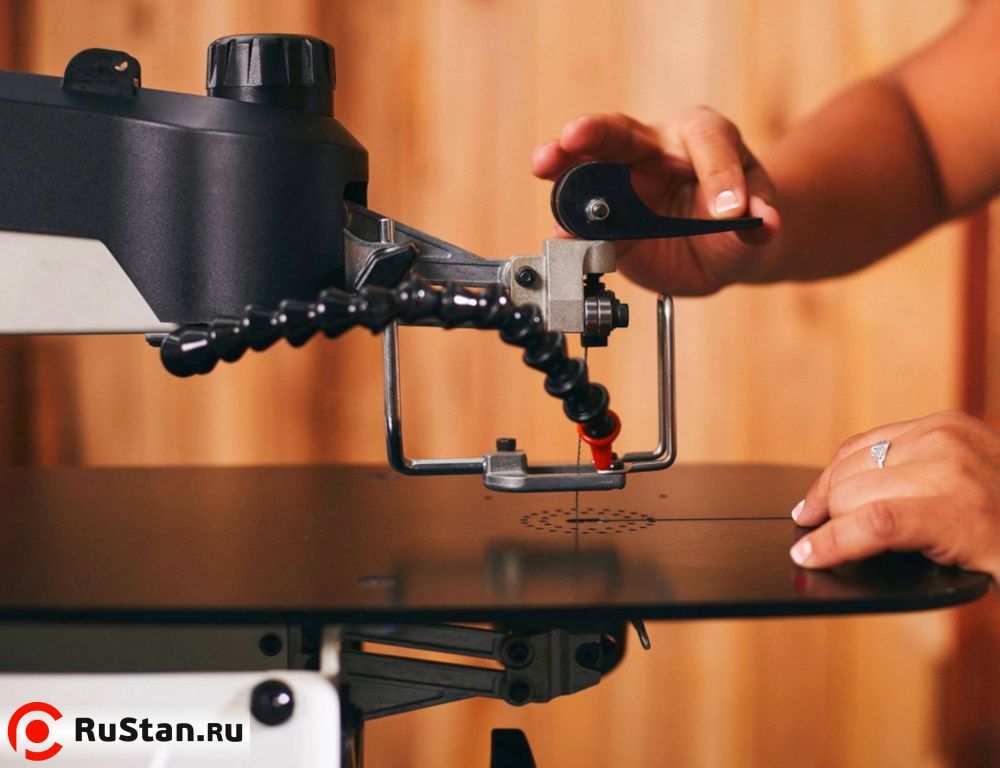 Станок работает с пильными полотнами без штифта. Верхняя часть пилки зажимается эксцентриковым механизмом, совмещенным с натяжителем, нижняя предварительно зажимается в адаптер, а после вставляется в вилку-оправку. В комплекте два таких адаптера, что позволяет иметь в быстром доступе полотна разных типов. Благодаря наличию прорези в рабочем столе существенно упрощается установка на стол заготовок с продетой пилкой.
