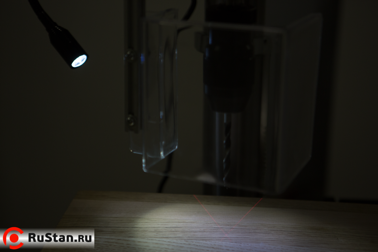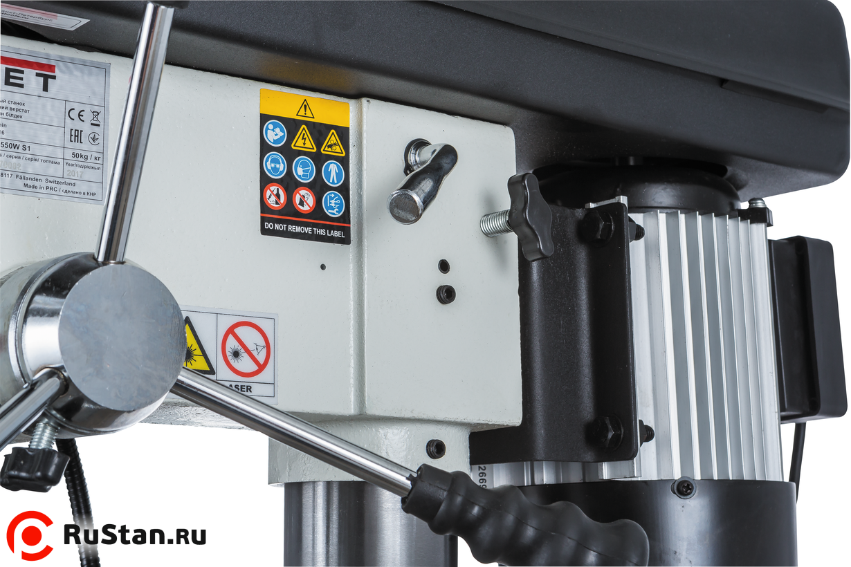 Массивный чугунный стол круглой формы имеет радиальные прорези для установки тисков (поставляются в комплекте) и может вращаться вокруг своей оси. Поворотный кронштейн обеспечивает наклон в обе стороны для сверления под углом и регулируется по высоте при помощи зубчато-реечного механизма. Рабочая область с прорезями есть и на основании станка, что позволяет работать от него, в этом случае расстояние до шпинделя будет достигать 1244 мм. Колонна, кронштейны, стол и прочие образующие конструкцию детали выполнены массивно и прочно, с расчетом на большие усилия при подаче сверла.