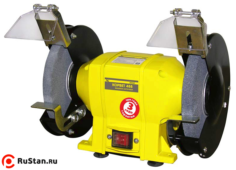 Станок оснащен мощным асинхронным двигателем. Хорошо сбалансированный вал и качественные подшипники исключают вибрацию и шум при работе. Отсутствие вибрации и резиновые опоры позволяют использовать станок без дополнительного крепления к верстаку. Безопасность при работе обеспечивают два широких защитных экрана. Для удобства в работе имеются регулируемые упоры. Станок комплектуется переходными кольцами для заточных кругов с посадочным диаметром 32 мм.