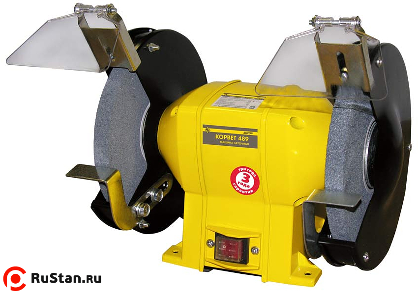 Станок оснащен мощным асинхронным двигателем. Хорошо сбалансированный вал и качественные подшипники исключают вибрацию и шум при работе. Отсутствие вибрации и резиновые опоры позволяют использовать станок без дополнительного крепления к верстаку. Безопасность при работе обеспечивают два широких защитных экрана. Для удобства в работе имеются регулируемые упоры. Станок комплектуется переходными кольцами для заточных кругов с посадочным диаметром 32 мм.
