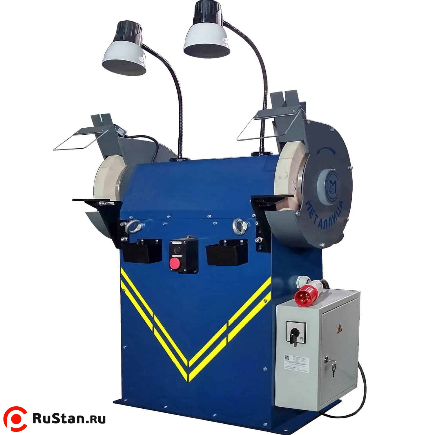 На станок установлен концевой выключатель для блокировки двигателя при поднятии защитного экрана. Регулировка упоров по горизонтали и вертикали обеспечивает удобную работу на станке. Установлены съемные металлические ёмкости для охлаждающей жидкости. Защитные кожуха имеют выходные вентиляционные патрубки для подключения пылеотсосов, позволяющих фильтровать воздух от абразивной пыли в рабочей зоне оператора.