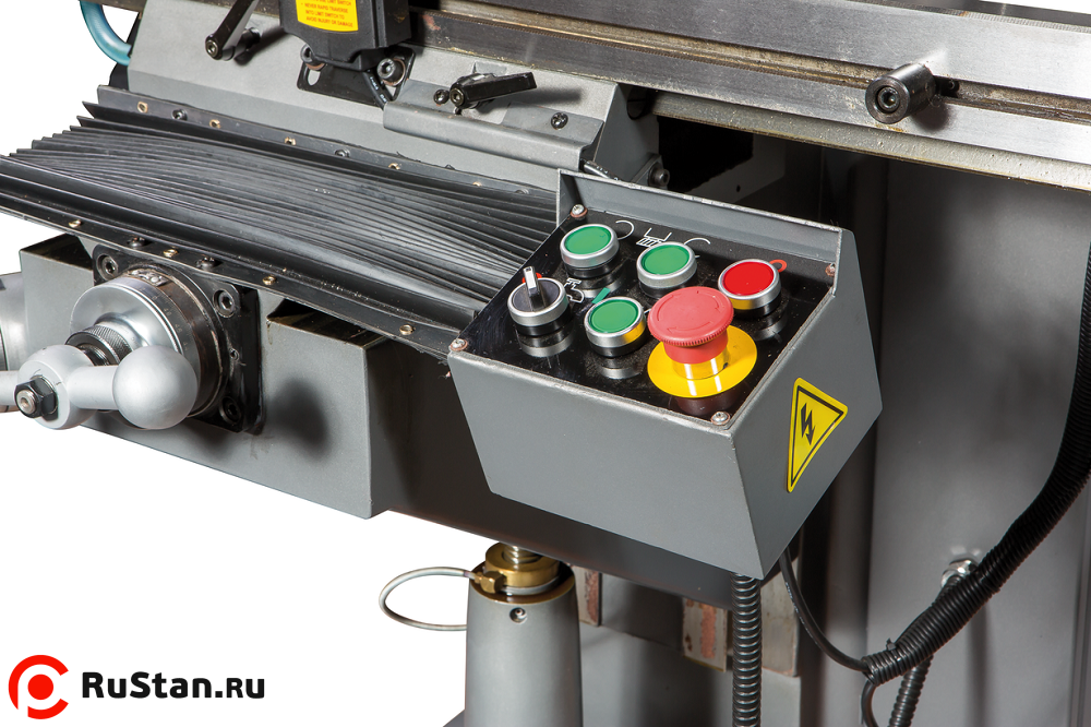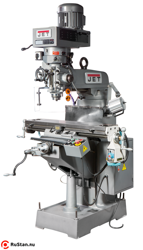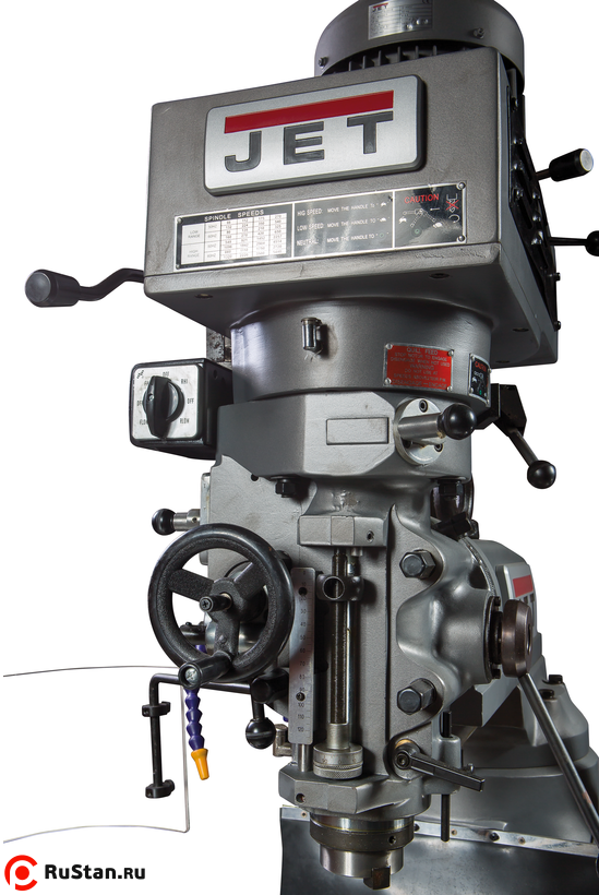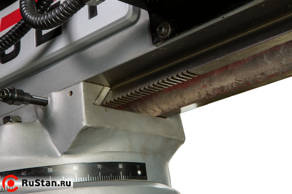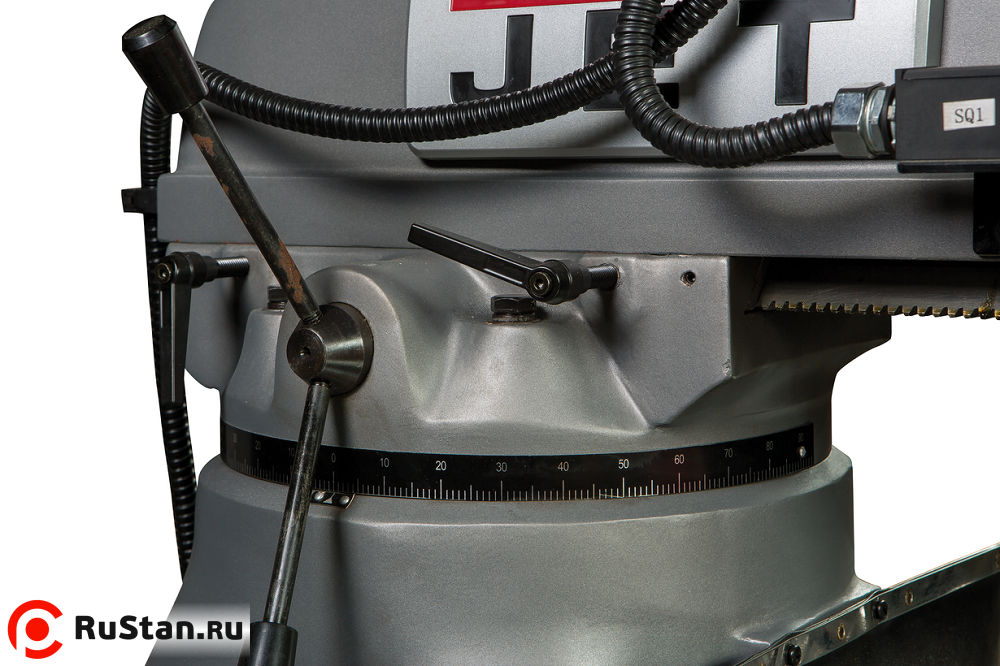 Для удобства оператора и расширения возможностей станка фрезерная головка оснащена механизмом поворота на 90° влево/вправо. Также предусмотрено переключение левого/правого вращения шпинделя и его механический тормоз. Направляющие JVM-836TS особым образом шлифуются по самым современным технологиям и снабжены регулируемыми клиновидными планками. Для точности, плавности и увеличения ресурса работы на станке применяется система централизованной смазки рабочего стола. Также в заводской комплектации имеется система подачи СОЖ.